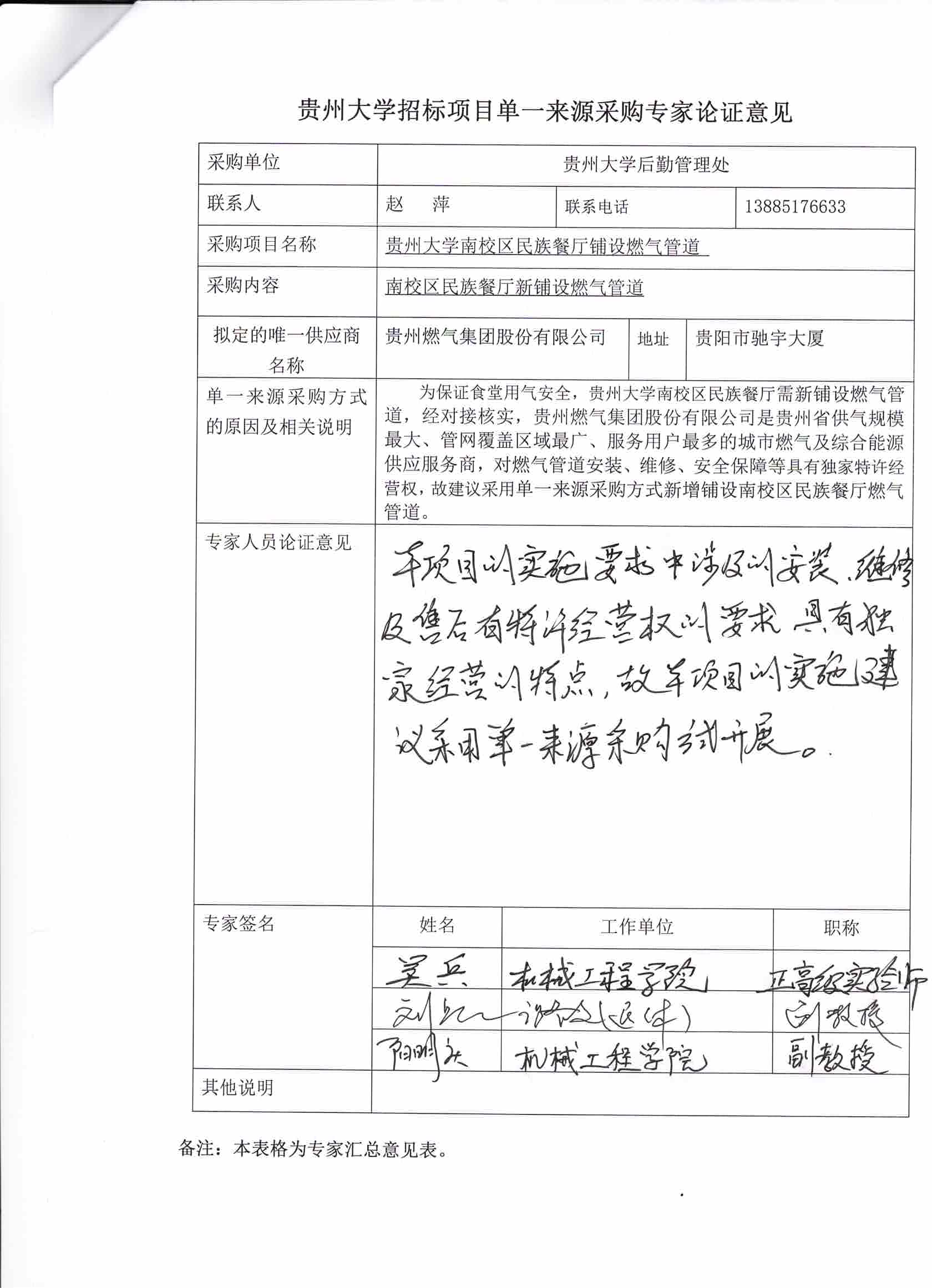 為保證食堂用氣安全,貴州大學南校區民族餐廳需新鋪設燃氣管道,經對接核實,貴州燃氣集團股份有限公司是貴州省供氣規模最大、管網覆蓋區域最廣、服務用戶最多的城市燃氣及綜合能源供應服務商,對燃氣管道安裝、維修、安全保障等具有獨家特許經營權,故建議采用單一來源采購方式新增鋪設南校區民族餐廳燃氣管道。。