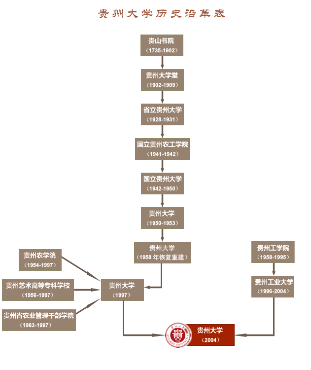 貴州大學(xué) 創(chuàng)建于1902年,歷經(jīng)貴州大學(xué)堂、省立貴州大學(xué)、國立貴州農(nóng)工學(xué)院、國立貴州大學(xué)。新中國成立后,于1950年10月定名為貴州大 學(xué)。1951年11月,毛澤東同志親筆題寫校名。1953年全國高等學(xué)校院系調(diào)整停辦,在其原址建立貴州農(nóng)學(xué)院,1958年恢復(fù)重建貴州大學(xué),同年建立貴州工學(xué)院。1997年8月,貴州大學(xué)、貴州農(nóng)學(xué)院、貴州藝術(shù)高等專科學(xué)校、貴州省農(nóng)業(yè)管理干部學(xué)院合并組建 為貴州大學(xué),成為貴州省唯一按“211工程”框架進(jìn)行重點(diǎn)投入、重點(diǎn)建設(shè)的省屬重點(diǎn)綜合性大學(xué),同時(shí)也是教育部在西部省(區(qū)) 重點(diǎn)扶持的大學(xué)之一。2004年8月,貴州大學(xué)與貴州工業(yè)大學(xué)合并組建為新的貴州大學(xué),同年12月,貴州省人民政府與教育部簽署協(xié)議共建貴州大學(xué)。2005年9月被批準(zhǔn)為國家“211工程”重點(diǎn)建設(shè)大學(xué)。2012年9月,被列為國家“中西部高校綜合實(shí)力提升工程”14所高校之一。2016年4月,被列為中西部“一省一校”國家重點(diǎn)建設(shè)高校。2017年9月,成為國家世界一流學(xué)科建設(shè)高校。2017年11月,學(xué)校獲首屆“全國文明校園”。2018年2月,學(xué)校成為教育部、貴州省人民政府部省合建高校。